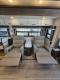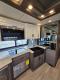 Step inside and experience a warm, residential atmosphere shaped by premium hardwood cabinetry, solid-surface counters, and designer finishes. The living area opens into a spacious, light-filled layout with sumptuous seating, theatre-style recliners or a luxe sofa, and an entertainment center that brings home-theater quality to your travels. The galley is built for real cooking — roomy refrigeration, generous counter space, and premium appliances — so every meal feels like dining at home.